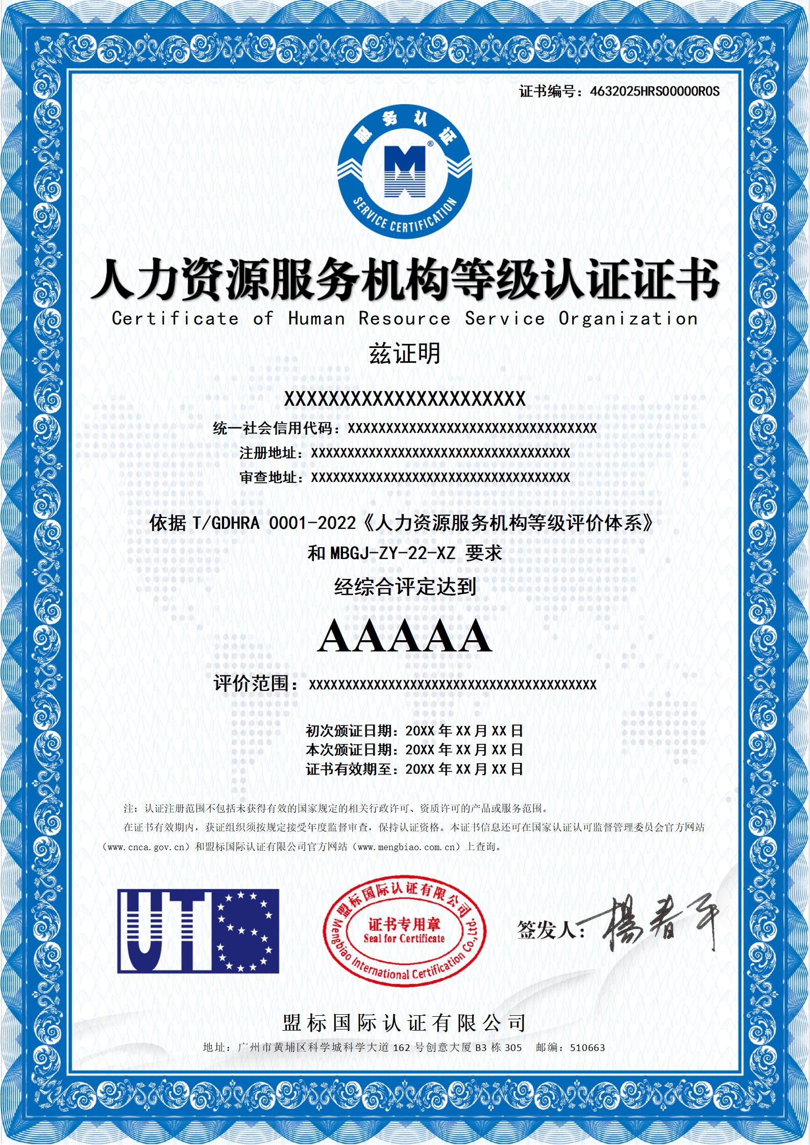 人力資源服務(wù)機(jī)構(gòu)等級(jí)認(rèn)證證書-樣版