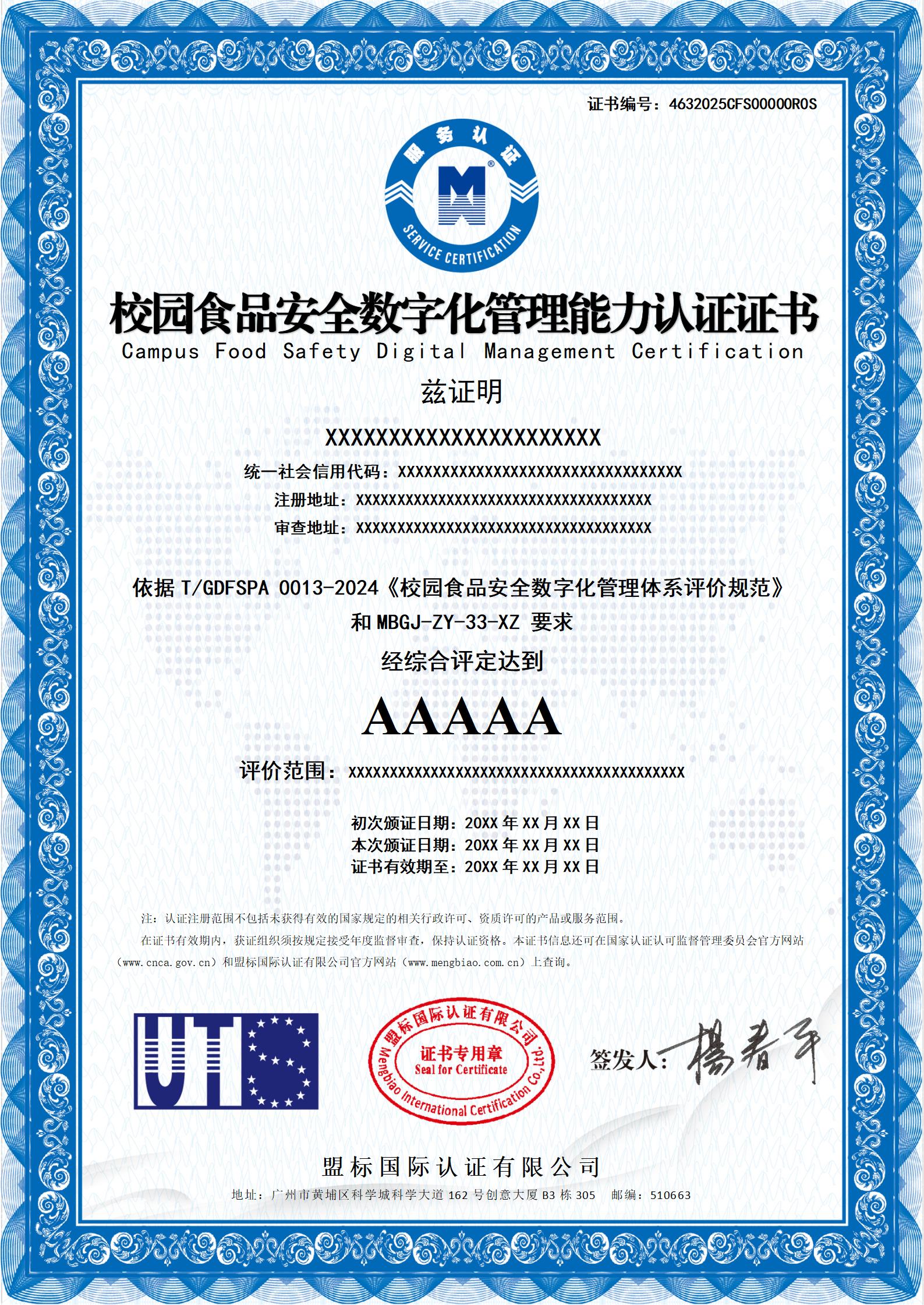 校園食品安全數(shù)字化管理能力認(rèn)證證書-樣版
